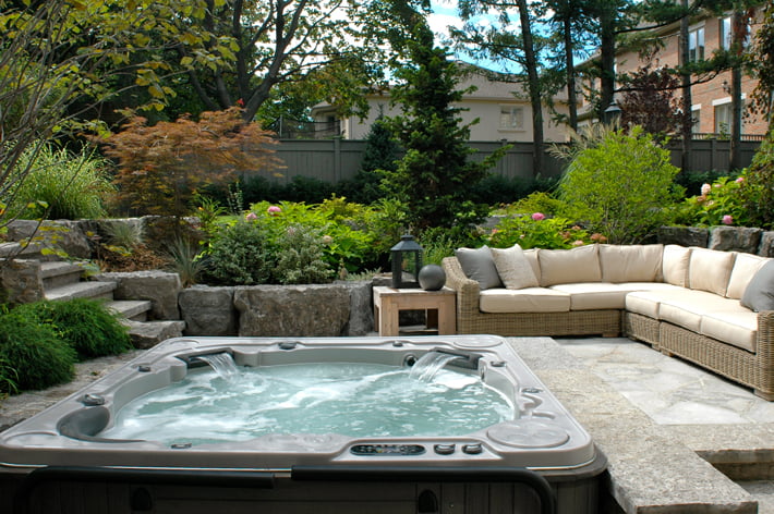 • Hot tubs can be integrated creatively into your backyard landscape.